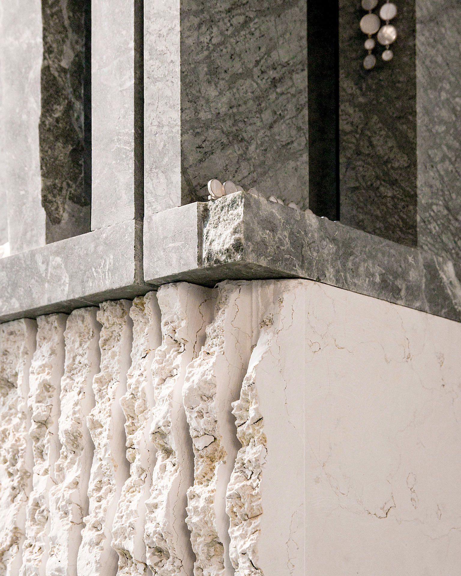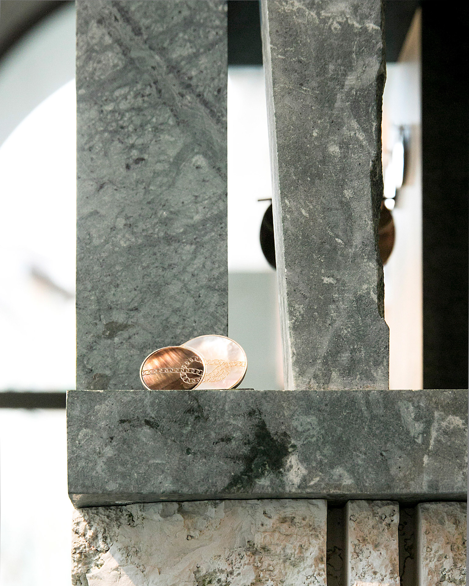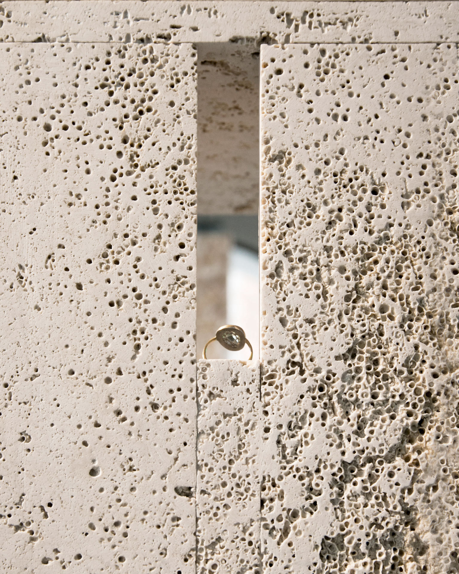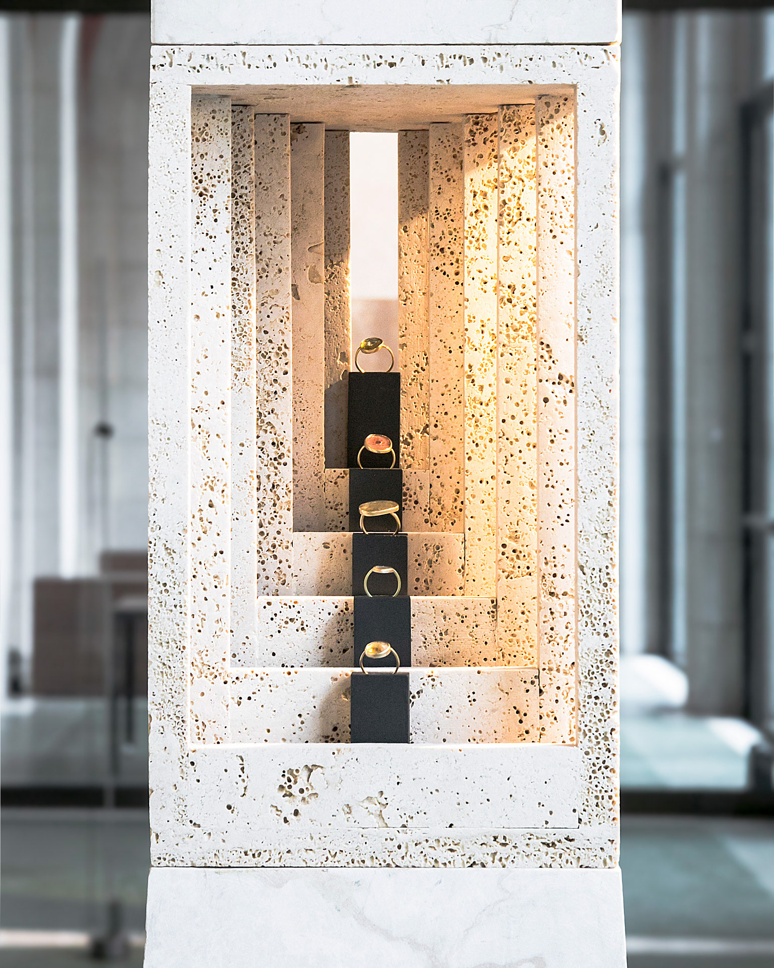 Innesti nasce come una ricerca sul rapporto tra gioiello e architettura, che fa dialogare scala, materia e memoria delle forme. Oro e argento si confrontano con la pietra, generando un dialogo tra l’arte orafa e l’arte della costruzione, tra dimensione intima e dimensione strutturale. L’installazione presenta gioielli di Carola Solcia Jewellery, di cui alcuni realizzati in marmo appositamente per questa occasione. In questi ultimi, il materiale tradizionalmente associato all’architettura e alla sfera pubblica, viene reinterpretato alla scala del corpo, trasformandosi in gioiello e instaurando un dialogo con il resto della collezione e con l’installazione che lo accoglie. Impronte, incisioni e superfici lavorate raccontano il gesto umano e il sapere dei mestieri. I gioielli sono custoditi all’interno di elementi architettonici litici che scandiscono il percorso espositivo, in un gioco di luci, ombre e materia che accompagna il visitatore. L’allestimento è progettato e curato da Atelier Federico Bertolo Architettura, attraverso il riutilizzo di materiali di scarto provenienti dalla lavorazione del marmo. Fondamentale il contributo di Roberto Faedo Marmi per la fornitura e la lavorazione dei materiali. Foto di Carmen Colombo.