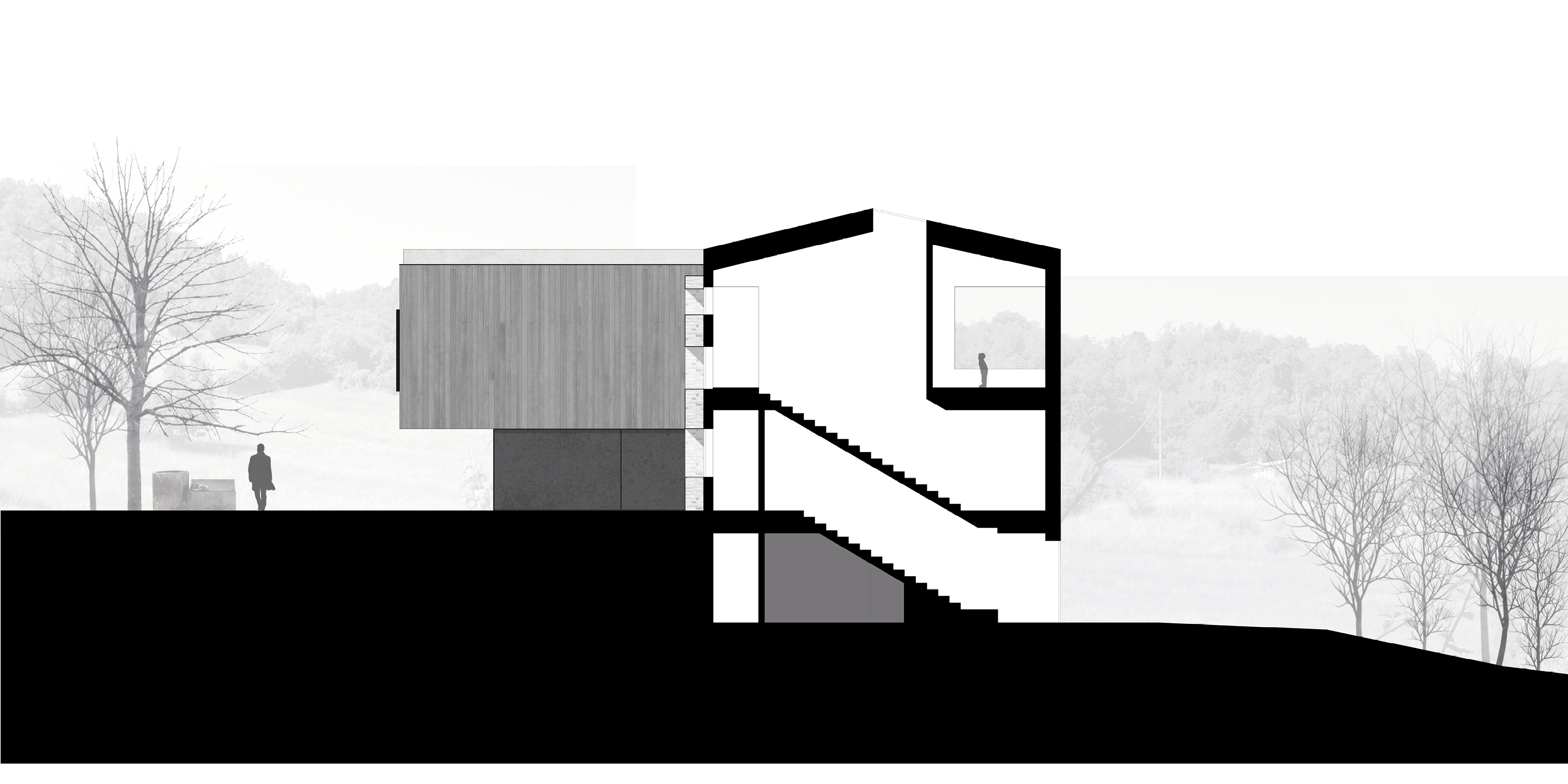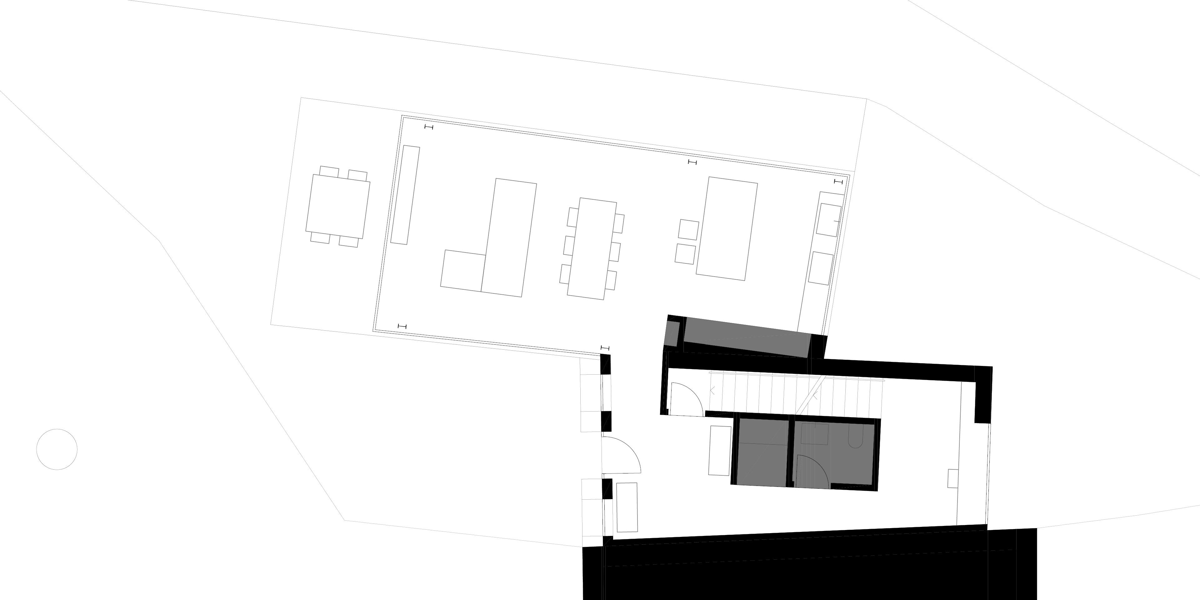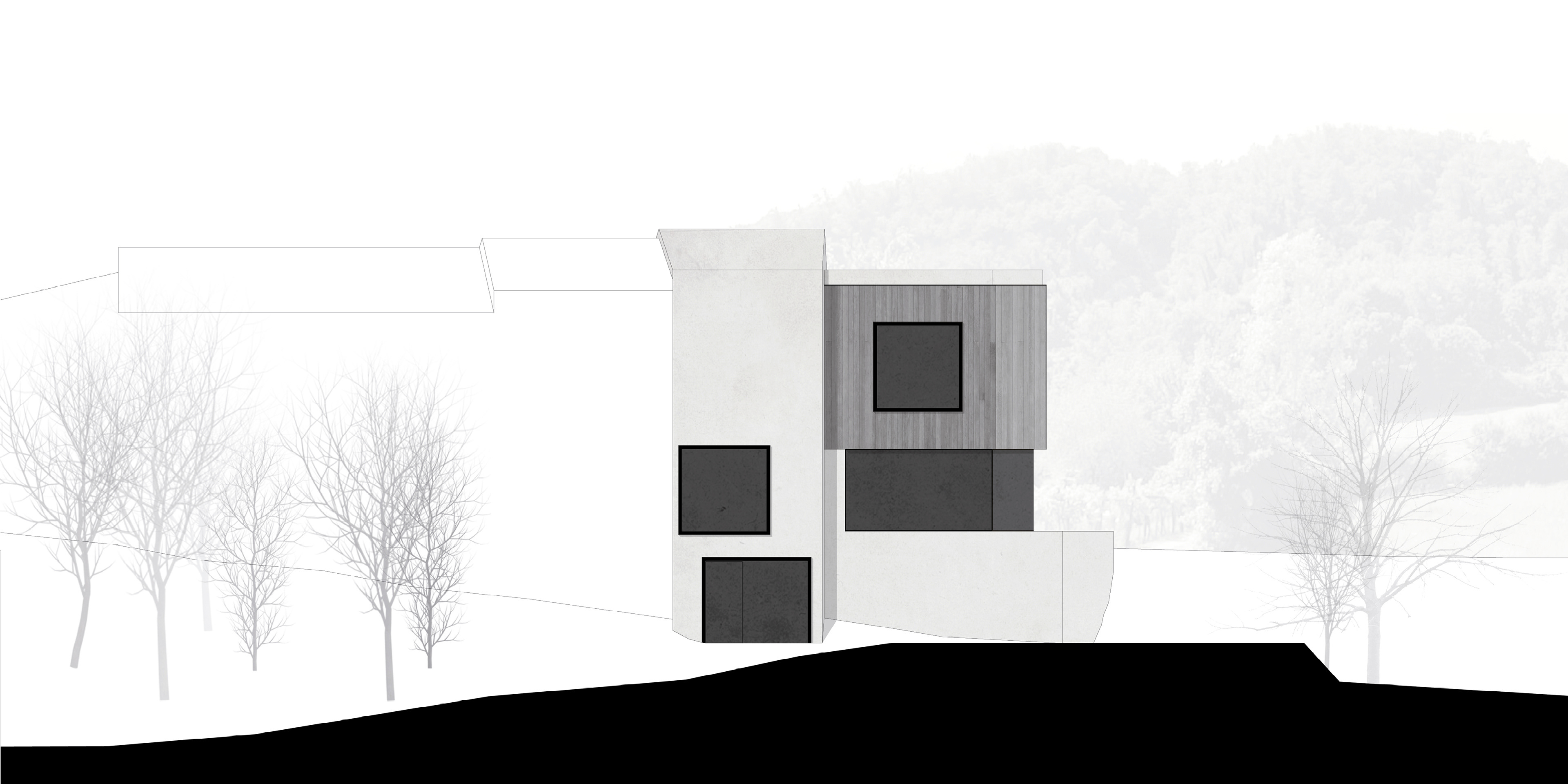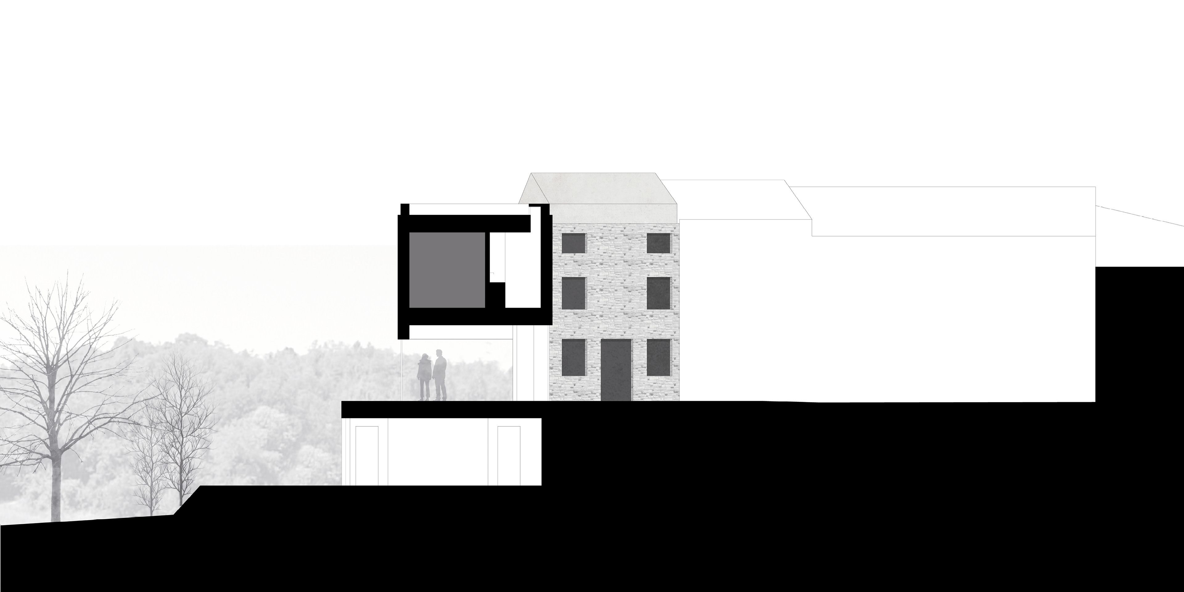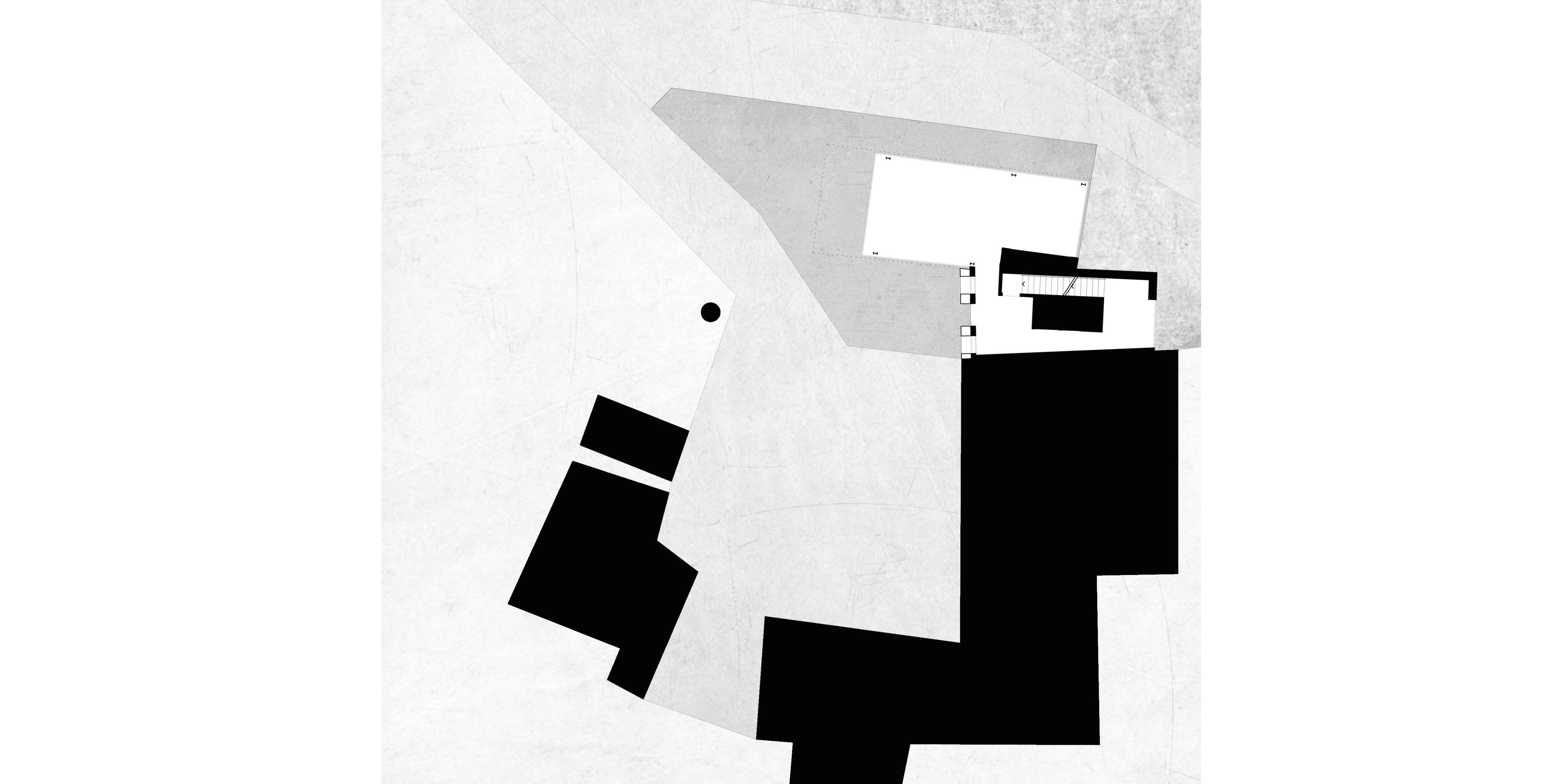 L’uso di un volume di ampliamento sospeso permette di liberare la vista dalla corte interna verso il paesaggio.