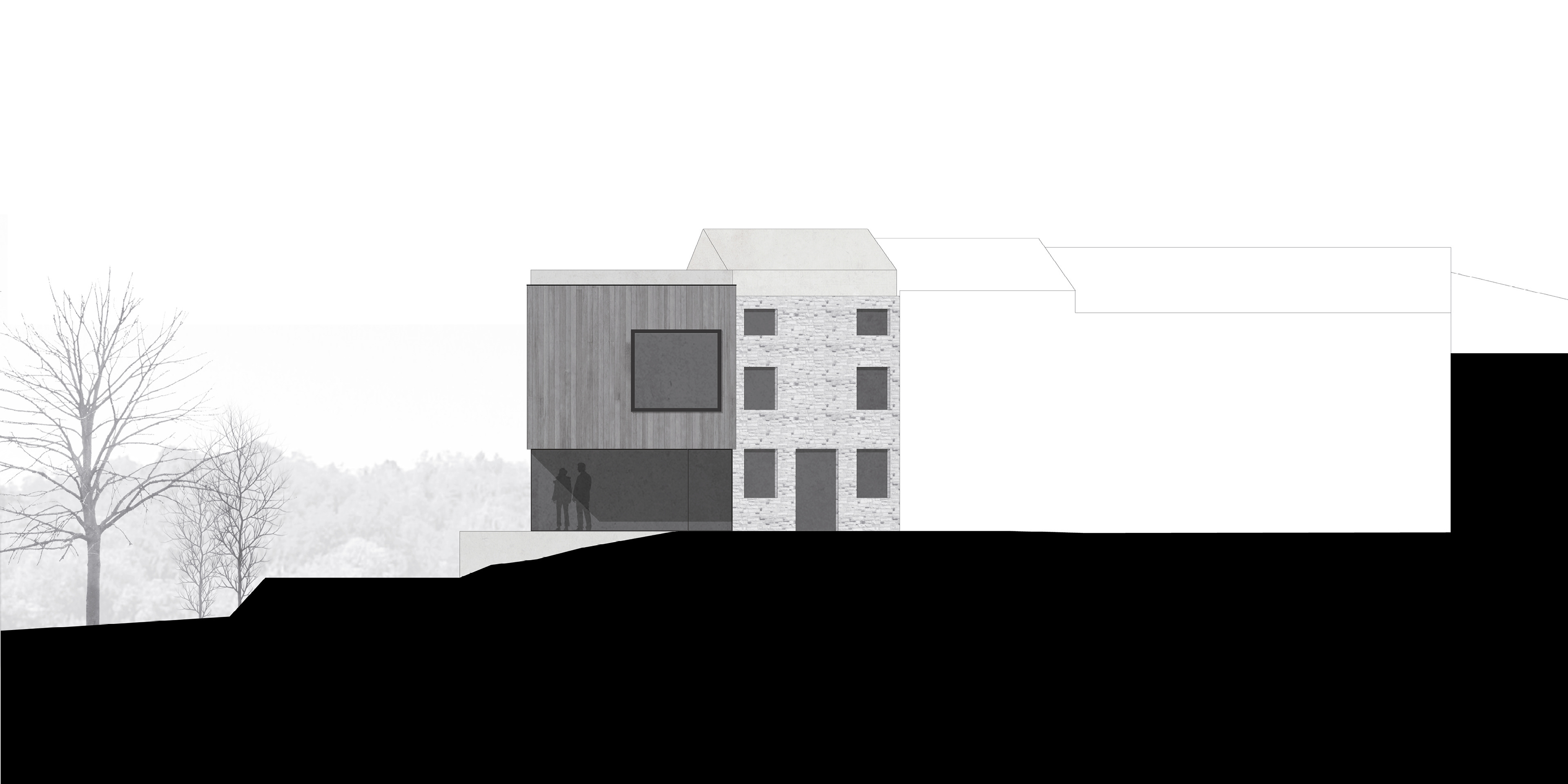 Il nuovo innesto di progetto si relaziona direttamente con le tipologie preesitenti e la facciata storica della casa.